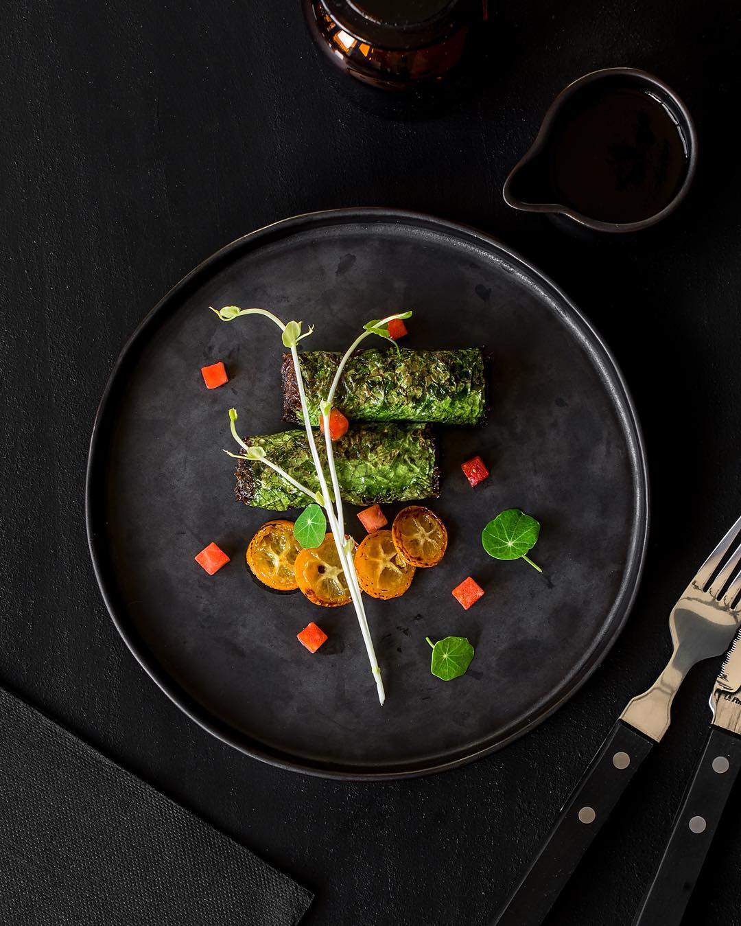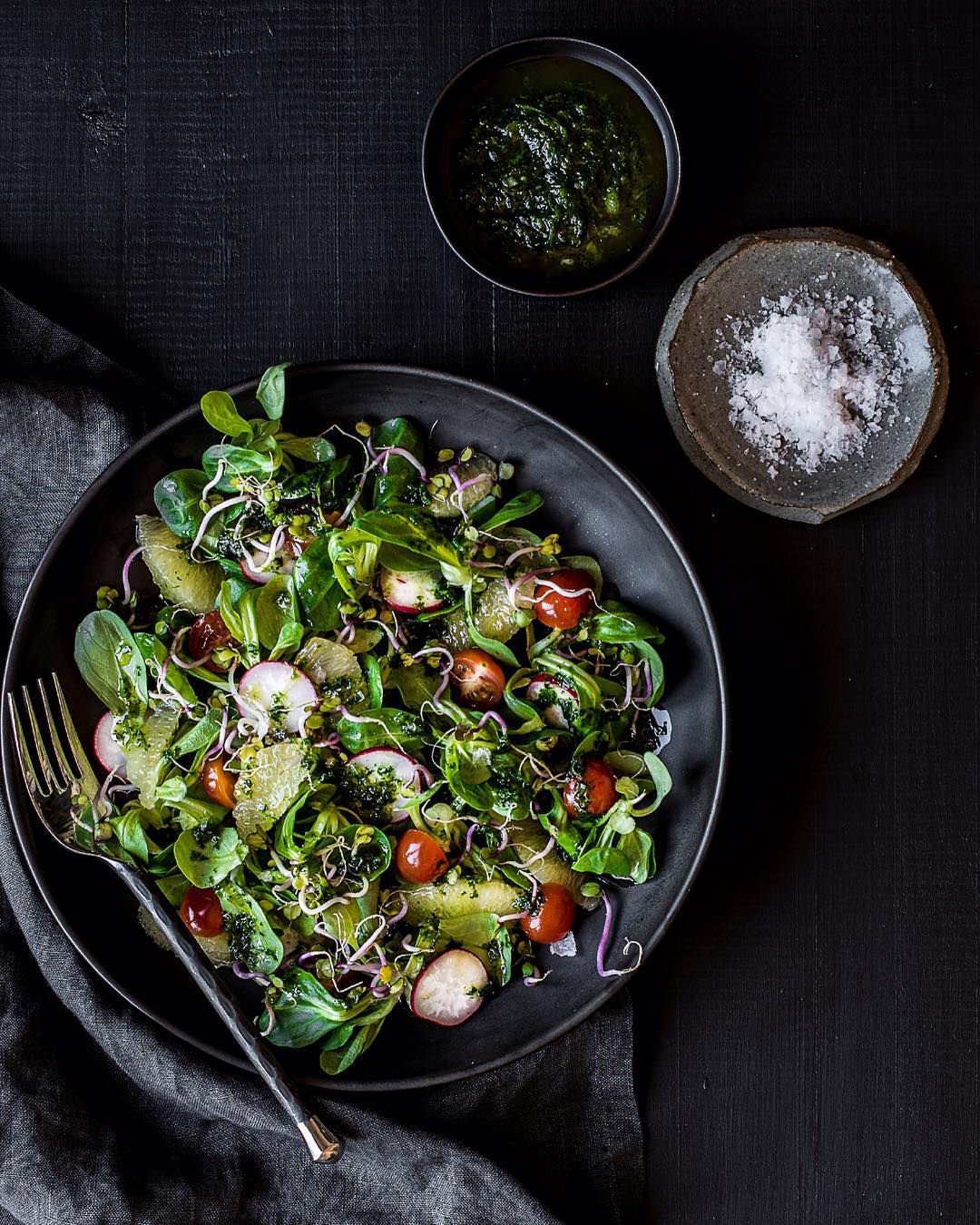 Сочетание хрустящих листьев с лососем гравлакс и йогуртовым соусом1040